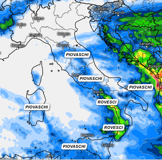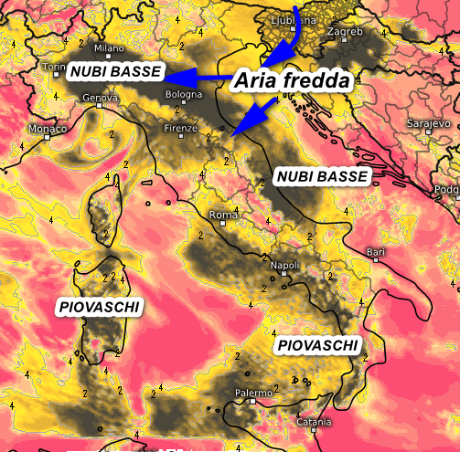 Al nord aria più fredda in rientro da est con nubi basse in pianura e temperature in calo. Condizioni di variabilità altrove con clima abbastanza mite e qualche piovasco possibile sulle Isole e al meridione.