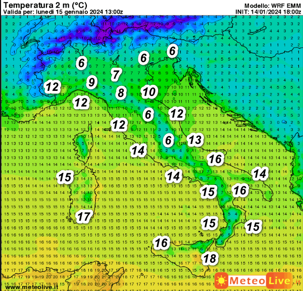 Ancora un po’ freddo al nord e nelle aree interne dell’Italia centrale con valori sotto i 10°. Aumento termico nelle vallate più settentrionali stante la presenza di venti di caduta dalle Alpi. Clima molto mite invece sul resto d’Italia con punte di 17-18° sulle due Isole Maggiori.