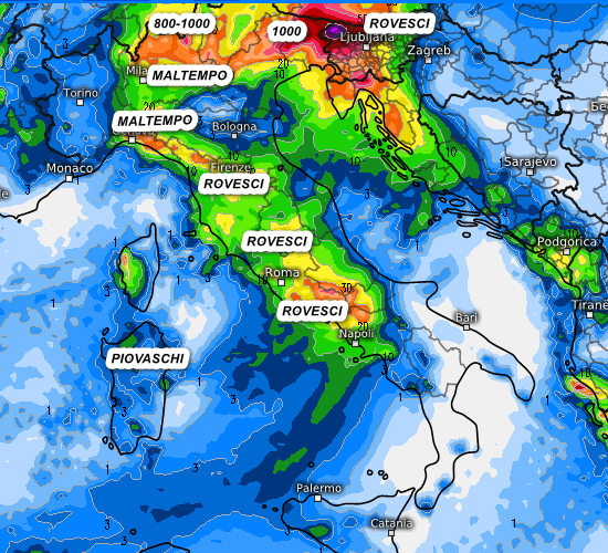 Come anticipato, la perturbazione darà il meglio di se: maltempo con rovesci su quasi tutto il nord ad eccezione del Piemonte occidentale e della Romagna. Quota neve in calo sulle Alpi fino a 800-1000 metri. Maltempo anche lungo il Tirreno e le aree interne fino alla Campania, con neve tra i 1400 ed i 1600 metri. Ancora in attesa le restanti regioni.