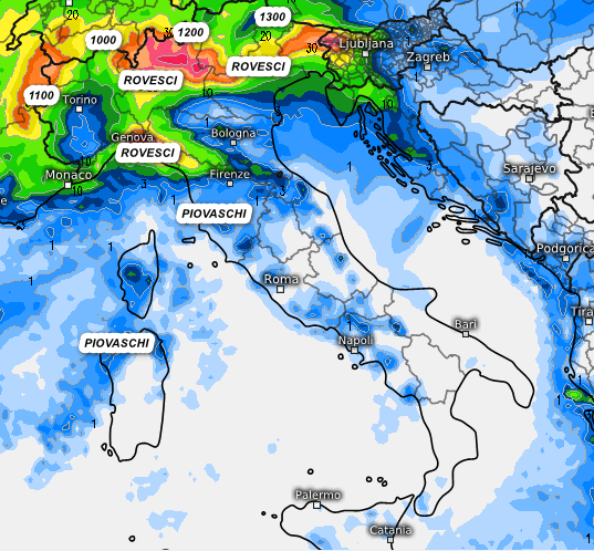 Andiamo però con ordine. Questa è la sommatoria delle precipitazioni attese in Italia fino alle 7 di domani mattina, venerdi 23 febbraio: