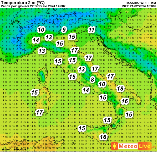 Sul fronte termico, il richiamo intenso di correnti meridionali porterà temperature molto miti. Ecco i valori termici attesi alle ore 15 di oggi pomeriggio: