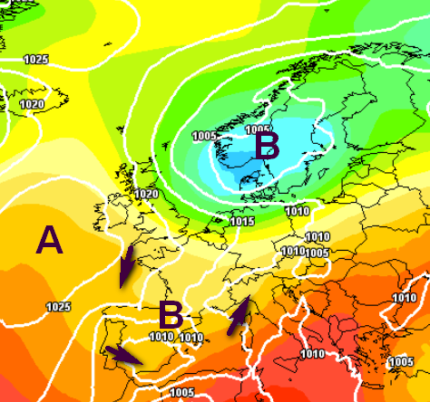 La scaldata prevista porterà i valori termici su pianure e zone interne in genere ad impennarsi sin oltre i 32°C su alcune zone del centro e del sud, mentre al nord si toccheranno al massimo i 30-31°C. Proprio il settentrione sarà già pronto a sperimentare da domenica 9 il ritorno dell’instabilità a partire da ovest, come vediamo chiaramente da questa carta barica: