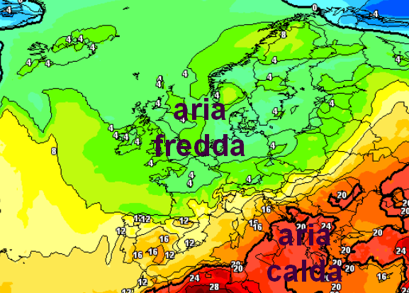 Proprio questo affondo genererà contrasti termici molto temibili e pericolosi che potranno dar luogo a violenti temporali tra nord e centro e un graduale ma generale calo termico, con arretramento della massa d’aria calda verso sud, come vediamo in questa carta termica a 1500m prevista per lunedì 10 giugno: