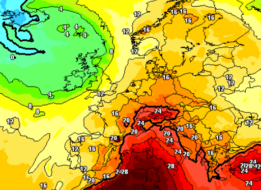 Nei giorni successivi il vortice si allontanerà verso est, sfaldandosi e perdendo dunque importanza, mentre una lingua calda africana riporterà sull’Italia temperature da forno per un paio di giorno, giusto tra giovedì 27 e sabato 29 giugno, qui le termiche attese a 1500m, con la Sardegna arrosto (zone interne over 40°C):