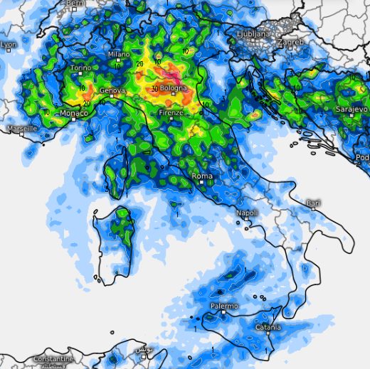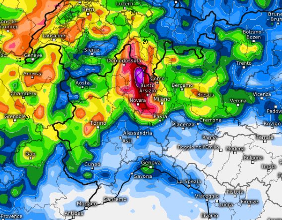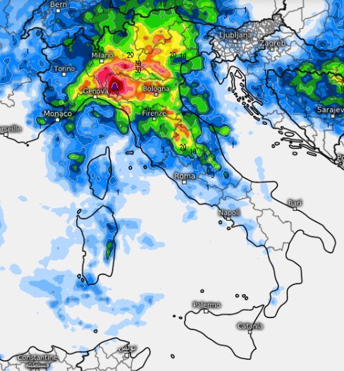 In un contesto barico simile ecco la probabile distribuzione dei fenomeni secondo il modello europeo tra domenica e lunedì, notate gli accumuli notevoli tra Emilia e bassa Lombardia: