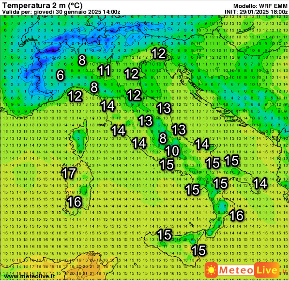 Sul fronte delle temperature, vi mostriamo i valori attesi in Italia alle ore 15 di giovedi 30 gennaio: