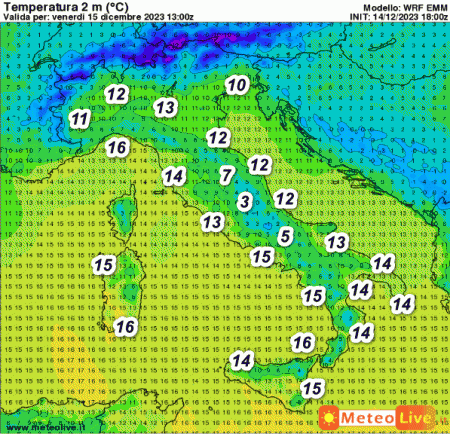 Temperature in generale calo con freddo nelle aree interne del centro e del meridione. Più mite la Sicilia meridionale, la Sardegna ed anche le coste liguri con 16°.