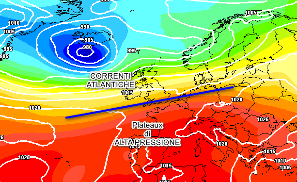 A sud della linea blu prenderà piede un plateaux di alta pressione che come anticipato interesserà quasi tutta l’Europa centro-meridionale. A nord della linea medesima scorrerà invece il flusso atlantico che interromperà la calura eccessiva presente da giorni sulla Penisola Scandinava con una depressione abbastanza profonda (980hpa) ubicata poco a sud dell’Islanda.