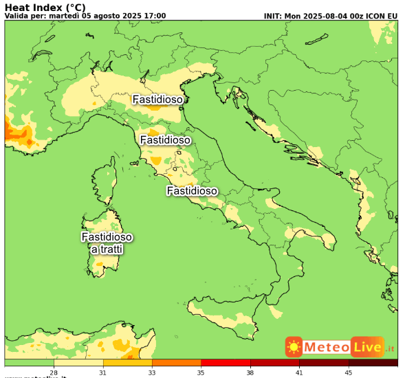 La seconda cartina mostra il DISAGIO da CALDO atteso in Italia alle ore 17 di martedì 5 agosto: