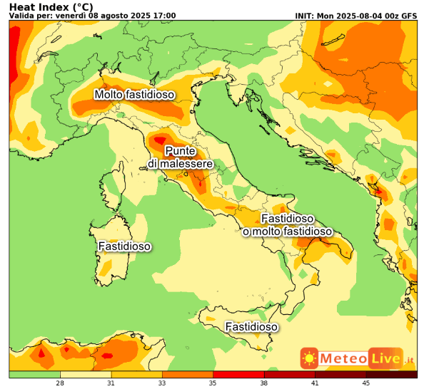 Avremo punte di MALESSERE FISICO nelle aree interne di Toscana, Lazio e sull’Umbria occidentale. Caldo MOLTO FASTIDIOSO su buona parte della Pianura Padana e su alcune aree interne del meridione peninsulare. Caldo “solo” FASTIDIOSO nelle aree interne della Sardegna, della Sicilia e sul restante meridione ad eccezione di alcuni settori costieri dove il caldo risulterà più SOPPORTABILE.