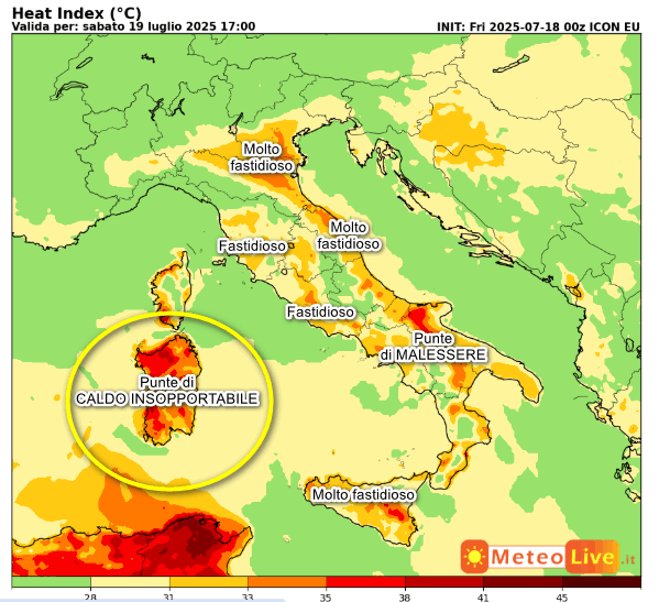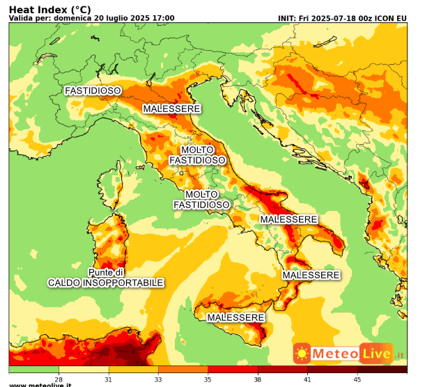 Condizioni di MALESSERE FISICO saranno presenti sul Foggiano e la Lucania; caldo MOLTO FASTIDIOSO sulla Romagna, le Marche, le pianure interne del Lazio e le aree interne della Sicilia, altrove caldo FASTIDIOSO, più SOPPORTABILE solo dove vedete il colore verde sulla mappa.