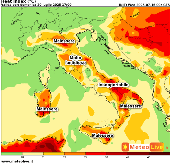 Questo invece è il DISAGIO da CALDO atteso in Italia alle ore 17 di domenica 20 luglio:
