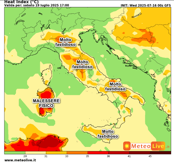 Condizioni di MALESSERE FISICO interesseranno molte aree della Sardegna, specie le zone interne più distanti dal refrigerio marittimo. Un caldo MOLTO FASTIDIOSO sarà presente sulla Pianura Emiliana, nelle aree interne della Toscana, sull’Umbria, le pianure interne del Lazio, la Sicilia orientale, il Foggiano e la Lucania. Il caldo risulterà invece più sopportabile dove vedete il colore verde o il giallo sulla mappa.