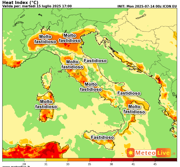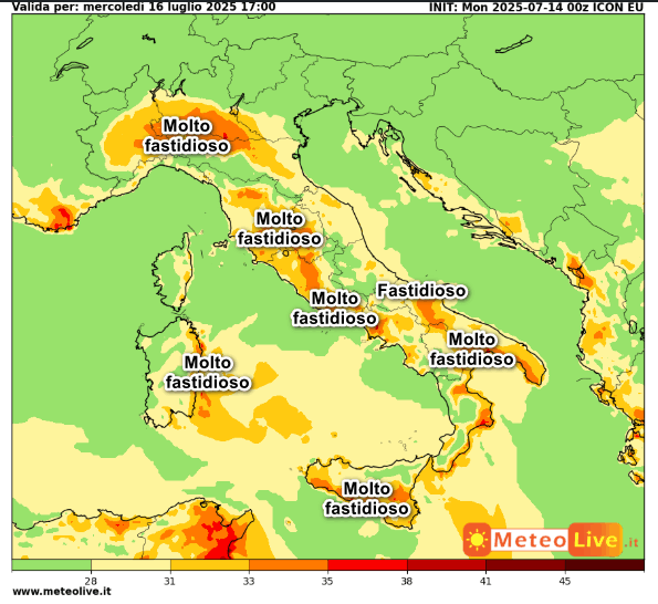 AL NORD caldo MOLTO FASTIDIOSO sulla Pianura Lombarda, più SOPPORTABILE altrove. AL CENTRO caldo MOLTO FASTIDIOSO su zone interne della Toscana e del Lazio, sull’Umbria e la Sardegna orientale, caldo più SOPPORTABILE sulle altre regioni. AL SUD caldo MOLTO FASTIDIOSO nel sud della Sicilia, la Calabria Ionica, il Golfo di Taranto e il Foggiano, oltre ad alcune aree della Campania.