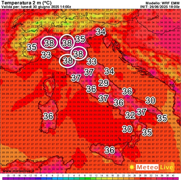 Quadro termico molto critico anche per la giornata di lunedi 30 giugno; queste sono le temperature previste alle ore 16: