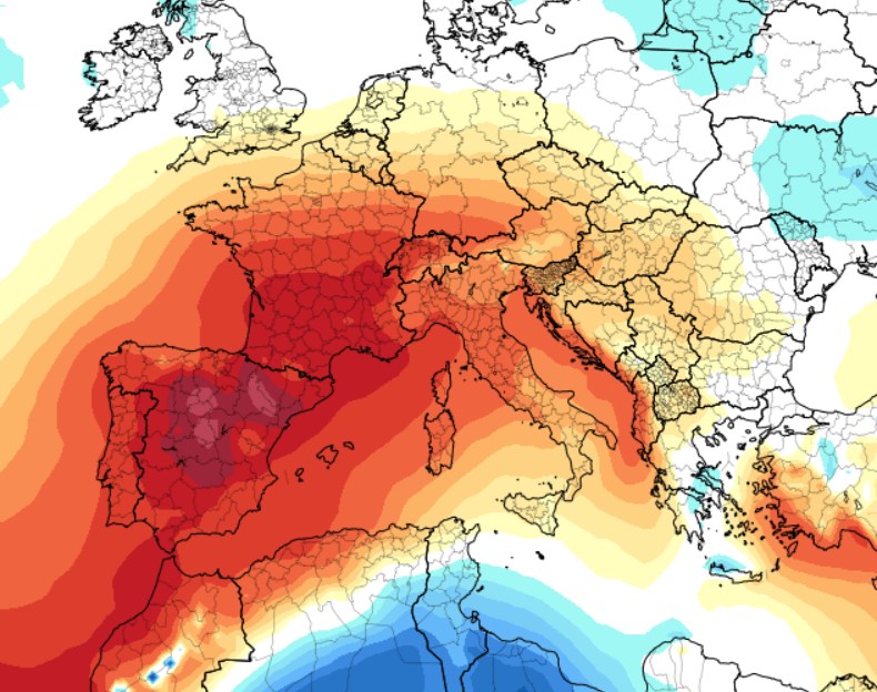 Ecco la mappa che mostra le anomalie di temperature previste fra il 7 e il 12 agosto, notate come siano più marcate sul nord-ovest e al centro: