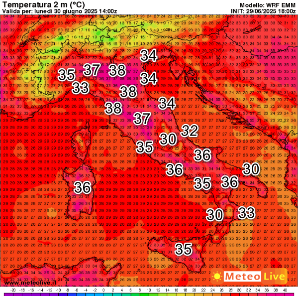 Cosa succederà nella giornata di lunedi 30 giugno sul nostro Paese? Per prima cosa parliamo delle temperature che resteranno ancorate su valori fuori da ogni senso e logica. Questi i valori termici previsti in Italia alle ore 16 di lunedi 30 giugno: