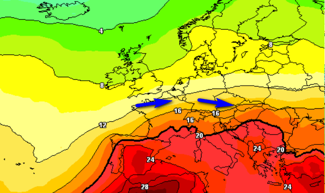 Ecco una media delle temperature previste a 1500m per il periodo 9-12 agosto sull’Europa mediterranea, come vedete il grande caldo colpirà soprattutto il centro-sud (isoterma di +20°C a 1500m):