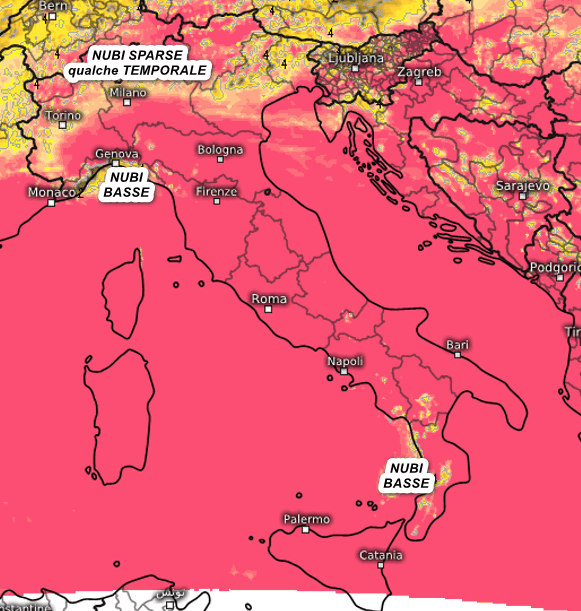Giornata in prevalenza soleggiata in Italia. Addensamenti saranno presenti su alcune aree del nord: nubi basse in Liguria specie al mattino, ma in attenuazione nel pomeriggio. Nubi sparse su Alpi e Prealpi con qualche temporale tra il pomeriggio e la serata che difficilmente arriverà sulle pianure. Qualche nube bassa per via del mare ancora freddo, si presenterà anche sulla Calabria.