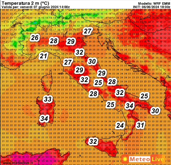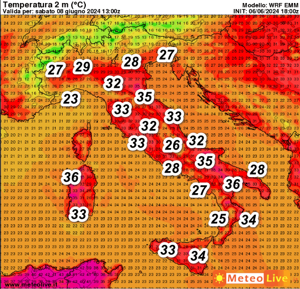 Infine, queste sono le temperature attese in Italia nell’arco della giornata di domani, sabato 8 giugno, fase culminante di questa breve apparizione dell’alta pressione africana in Italia: