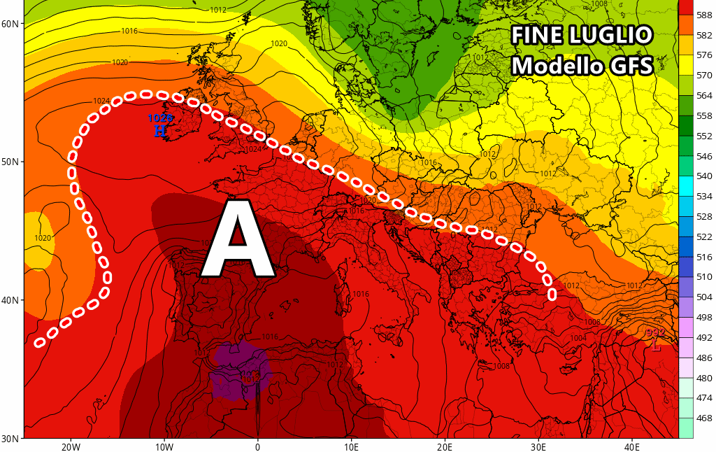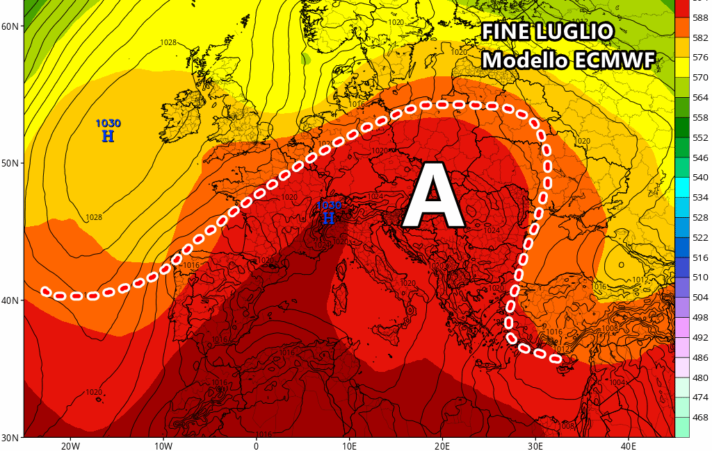 Anche il modello europeo ECMWF strizza l’occhio al collega americano, palesando un potente anticiclone nel finale di Luglio su tutta Italia.