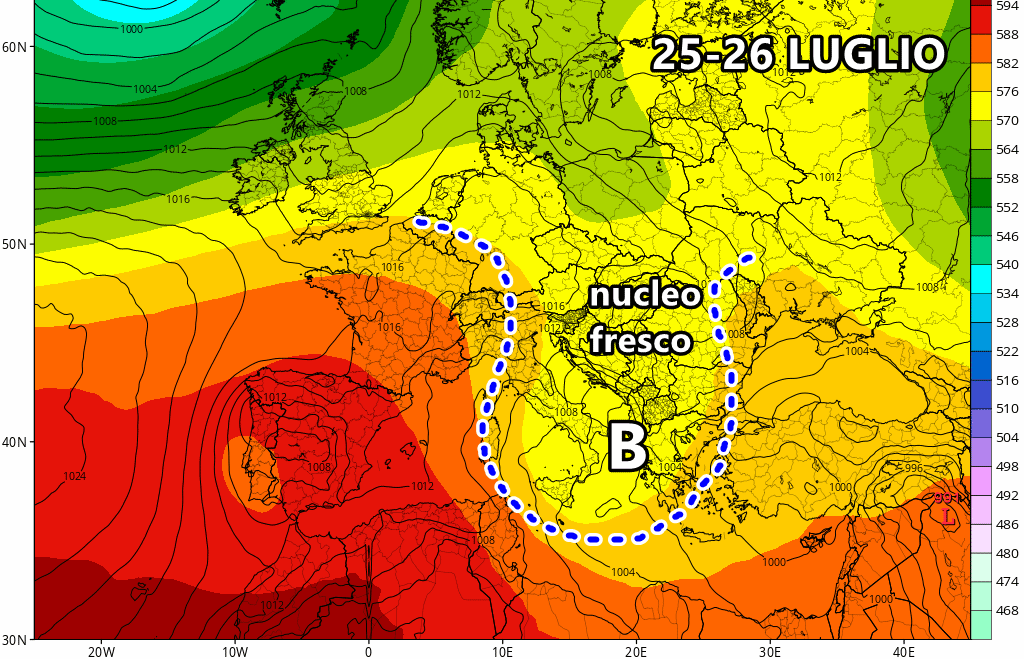 La parentesi meno calda potrebbe culminare tra 25 e 26 Luglio con una improvvisa, ma isolata, irruzione fresca dai Balcani che addirittura potrebbe far scivolare le temperature leggermente sotto le medie del periodo!