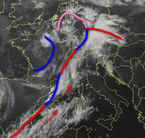 Ecco la lunga perturbazione che al momento si distende dal Mediterraneo occidentale all’Europa centrale. Il suo movimento verso levante sarà piuttosto lento, in quanto ostacolato da una zona anticiclonica di matrice africana posta più ad est.