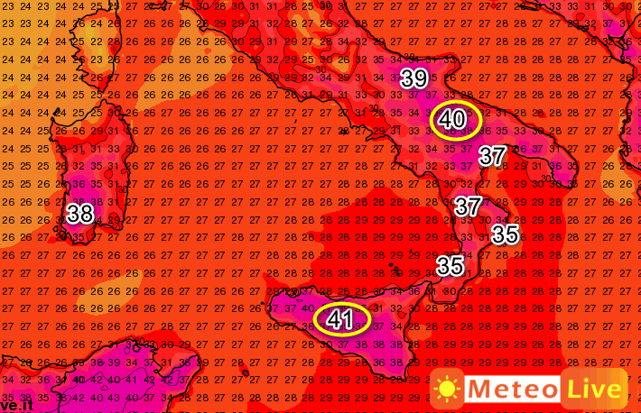 Punte di 41° nelle zone interne della Sicilia, 40° nel Foggiano, 38° sulla Sardegna meridionale e 37° su Calabria e Lucania. Restate sintonizzati su MeteoLive per tutti gli ultimi aggiornamenti.