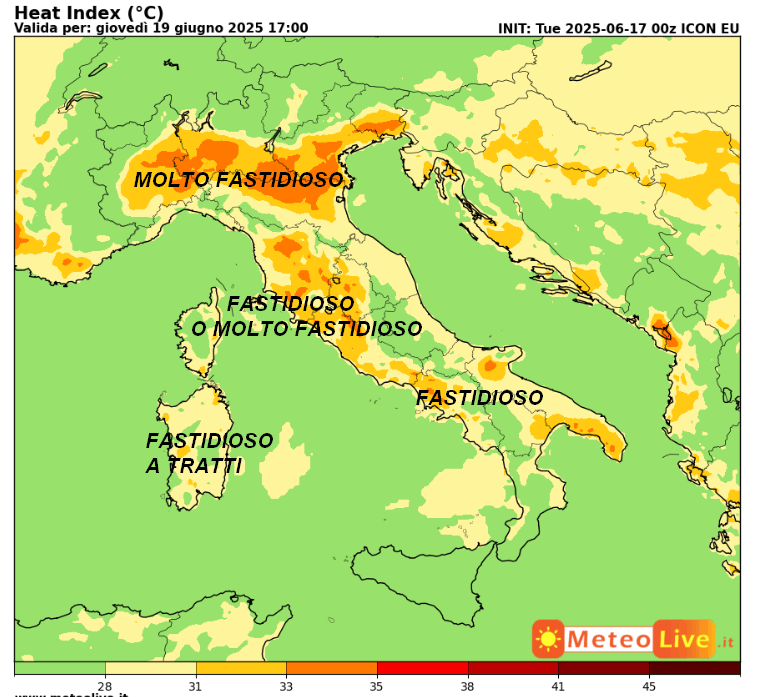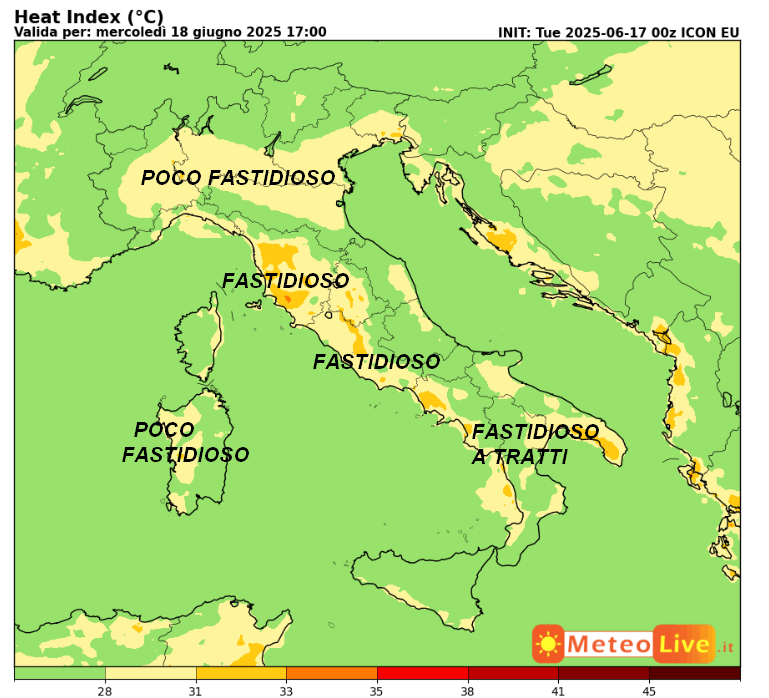 Notiamo un caldo FASTIDIOSO sulla Toscana e nelle aree interne del Lazio. Caldo FASTIDIOSO a TRATTI su Campania e Puglia, specie lungo le aree costiere. Caldo POCO FASTIDIOSO in Sardegna, sulla Pianura Padana ed in Liguria, altrove avremo condizioni di caldo SOPPORTABILE.