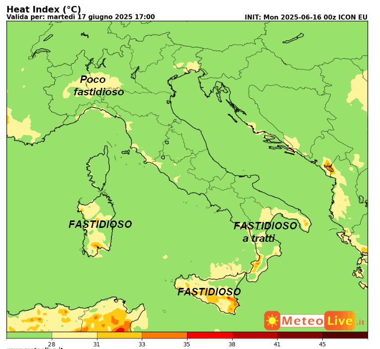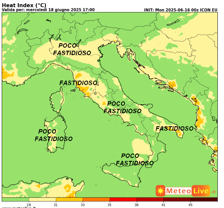 CALDO FASTIDIOSO tra Toscana e Lazio, oltre alla punta estrema della Puglia. Altrove CALDO POCO FASTIDIOSO se non addirittura SOPPORTABILE laddove vedete il colore verde sulla mappa.