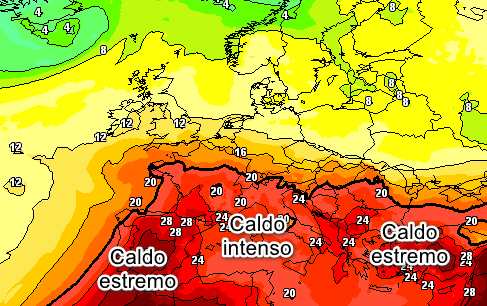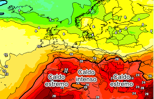 La situazione più critica sarà presente sulla Penisola Iberica dove avremo temperature alla medesima quota comprese tra 28 e 30°, che si riverbereranno al suolo con temperature oltre i 45°. La situazione si prevede difficile anche tra la Grecia e il Mediterraneo orientale dove avremo punte di 24-25° a 1500 metri che al suolo causeranno temperature oltre i 40°. Caldo intenso ovviamente anche in Italia con 22-23° a 1500 metri e possibili picchi al suolo attorno a 40°.