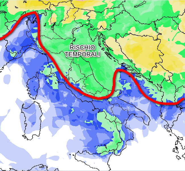 Osservando la mappa, notiamo come i rovesci e i temporali risulteranno più probabili sui versanti orientali della Penisola e le aree interne, dove l’incontro tra masse d’aria diverse favorirà lo sviluppo di fenomeni instabili. Al contrario, lungo il Tirreno, sul Nord-Ovest e sulle Isole, la medesima probabilità sarà decisamente più bassa, se non del tutto nulla, preannunciando giornate più stabili e soleggiate in queste aree.