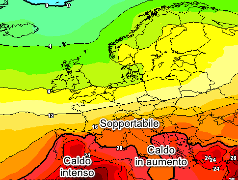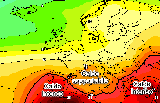 Per comprendere meglio l’evoluzione, analizziamo le temperature in quota. La prima mappa ci offre un’istantanea delle temperature a 1500 metri attese in Europa e sul Mediterraneo nelle ore centrali di venerdì 25 luglio.