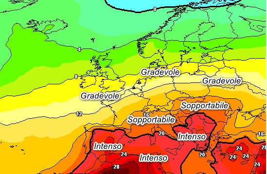 Volgendo lo sguardo in avanti, verso l’ultima settimana del mese, il quadro appare ancora più confortante. La mappa prevista per domenica 24 agosto mostra uno scenario radicalmente diverso: