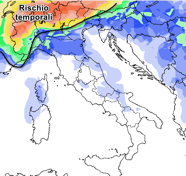 È chiaro che, al di là delle Alpi e in parte delle alte pianure dove potremmo avere una probabilità di temporali anche elevata, sul resto d’Italia tale probabilità sarà estremamente bassa, se non del tutto nulla nelle zone indicate in bianco sulla mappa.