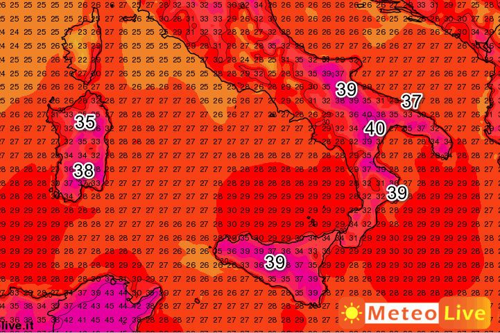 Punte di 40° sulla Lucania, 39° su Sicilia, Calabria Ionica e Foggiano, 38° sulla Sardegna meridionale. Sul restante meridione temperature meno estreme.