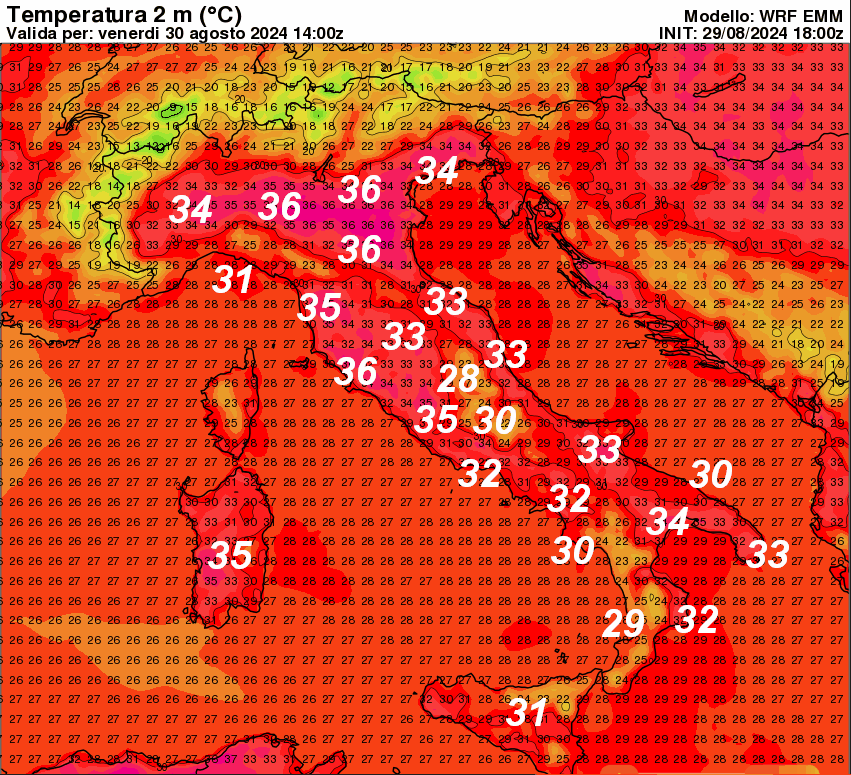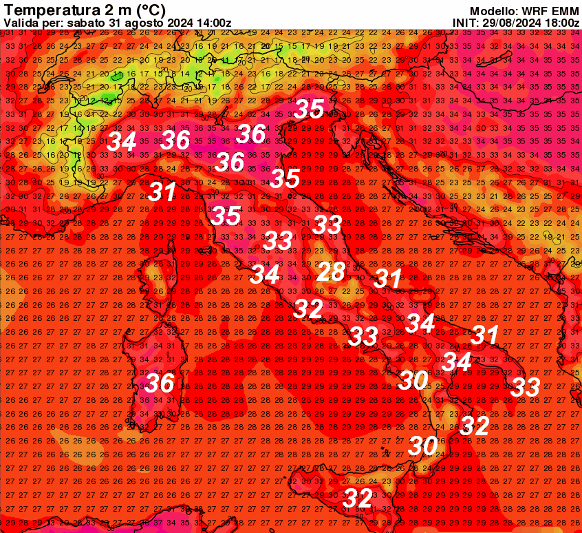 Infine, queste sono le temperature attese in Italia alle ore 16 di domani, sabato 31 agosto. Possiamo omettere la mappa dei fenomeni in quanto saranno poco probabili quasi ovunque:
