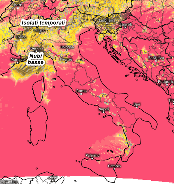 Al centro e al sud bel tempo e con temperature in aumento. Al nord nubi basse sulla Liguria e qualche temporale sulle Alpi tra pomeriggio e sera, più sole sulle pianure.