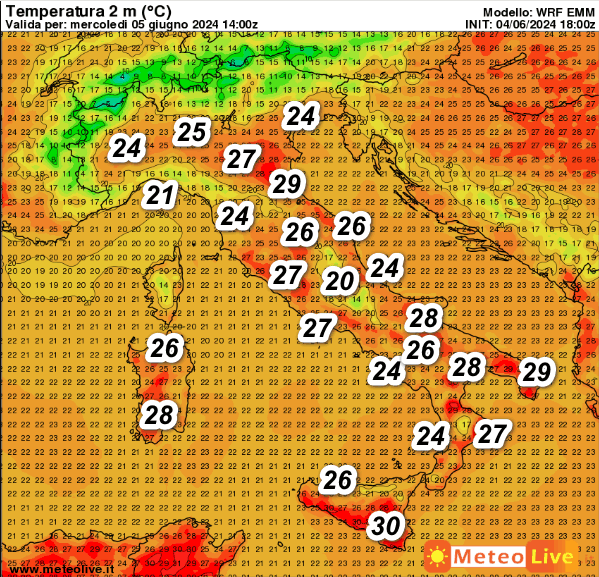 Temperature ancora nel complesso gradevoli in Italia, ma si evincono già 30° nel sud della Sicilia e 29° sulla Romagna e nel Salento.