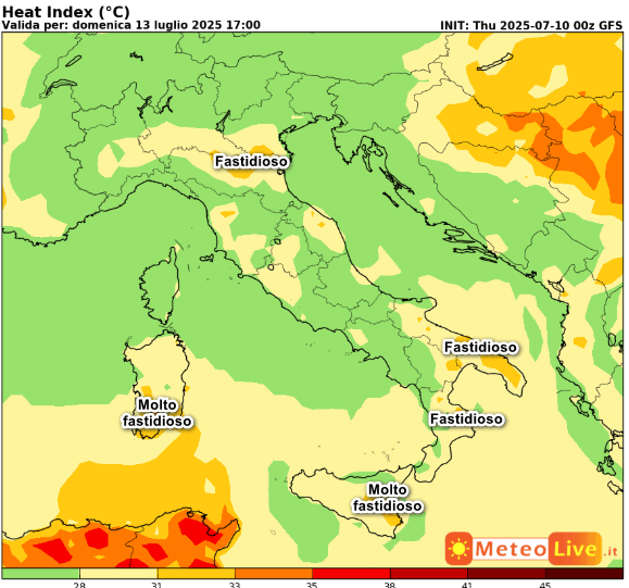 Notiamo che il caldo risulterà a tratti MOLTO FASTIDIOSO sulla Sardegna centrale ed occidentale. Sarà invece FASTIDIOSO sulla Sicilia orientale e sul Foggiano. Su tutte le altre regioni il caldo risulterà POCO FASTIDIOSO o addirittura SOPPORTABILE dove vedete il colore verde sulla mappa.