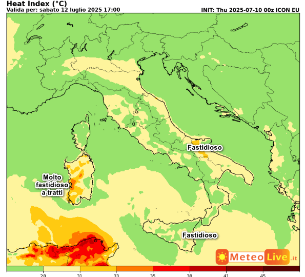 La prima mappa mostra l’INDICE di DISAGIO da CALDO previsto in Italia alle ore 17 di sabato 12 luglio: