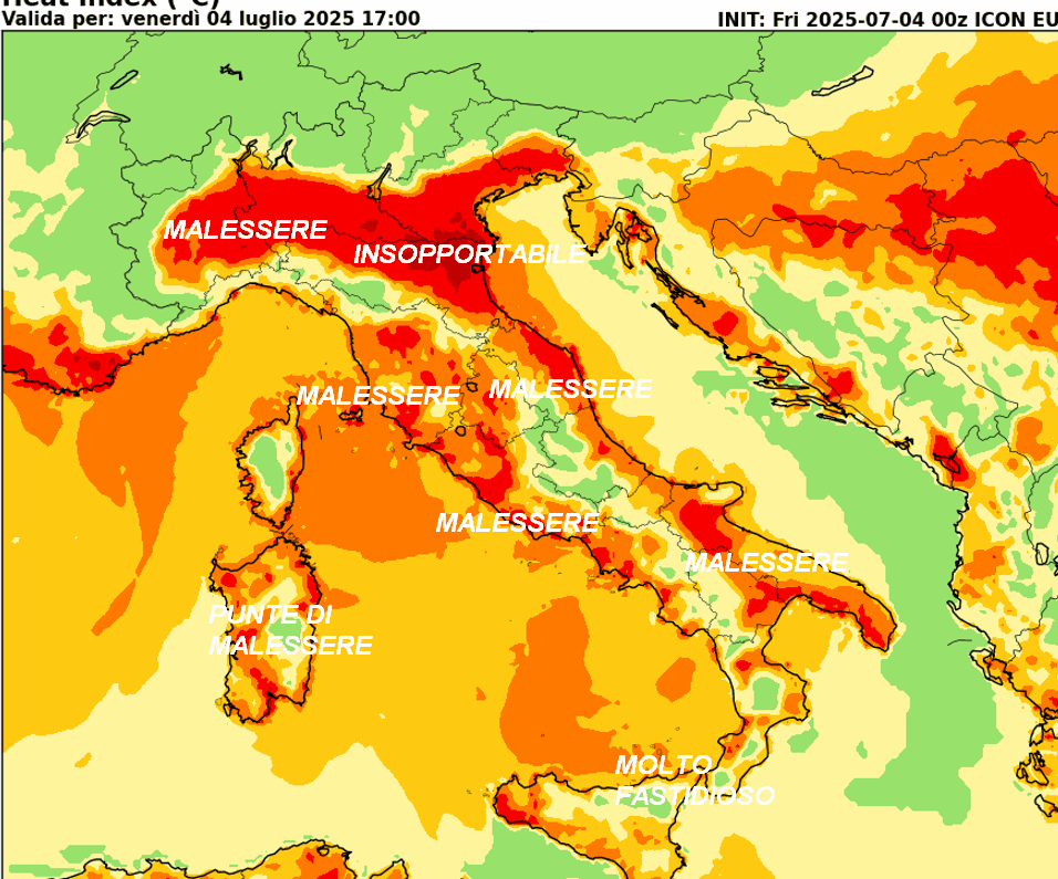 La giornata di VENERDI 4 LUGLIO sarà ancora da BOLLINO ROSSO su tutta l’Italia. Questo è l’INDICE di DISAGIO da CALDO atteso in Italia alle ore 16 della giornata in questione: