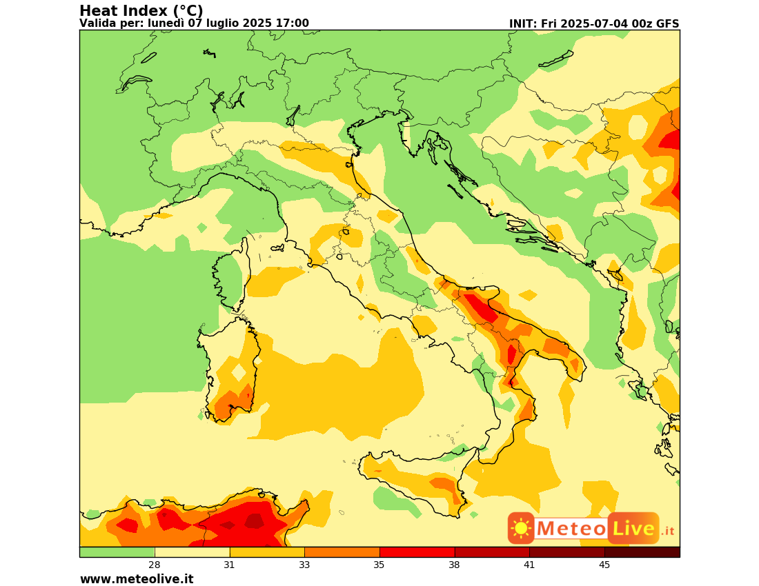Notiamo punte di CALDO INSOPPORTABILE su alcune zone dell’Emilia Romagna. Condizioni di MALESSERE FISICO saranno presenti praticamente su quasi tutta l’Italia ad eccezione solo delle aree di montagna. Anche lungo le coste, le brezze di mare non funzioneranno più stante le temperature superficiali marine attorno a 26-28°.