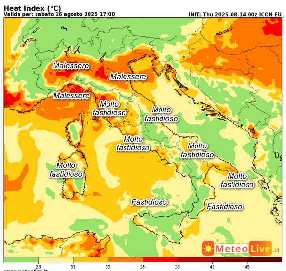Passiamo adesso al DISAGIO da CALDO atteso in Italia alle ore 17 di sabato 16 agosto: