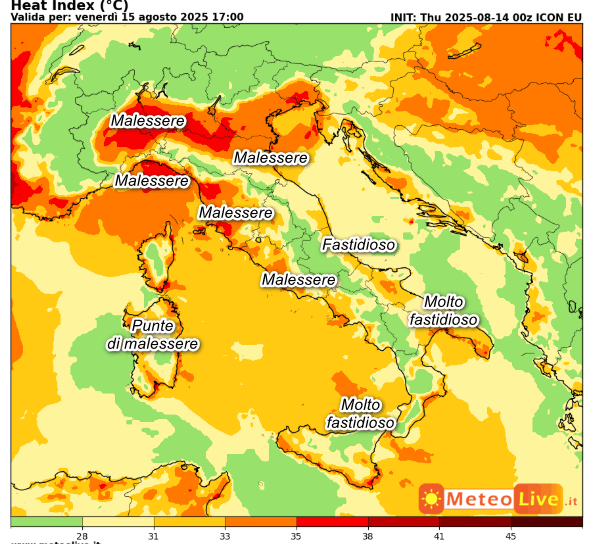 Condizioni di MALESSERE FISICO su Valpadana, Liguria, Toscana e Lazio. Punte di MALESSERE anche su parte della Sardegna. In queste regioni sono ancora sconsigliate le uscite nelle ore più calde soprattutto per anziani, bambini e soggetti con problemi respiratori. Caldo MOLTO FASTIDIOSO al meridione e solo FASTIDIOSO lungo il versante adriatico.