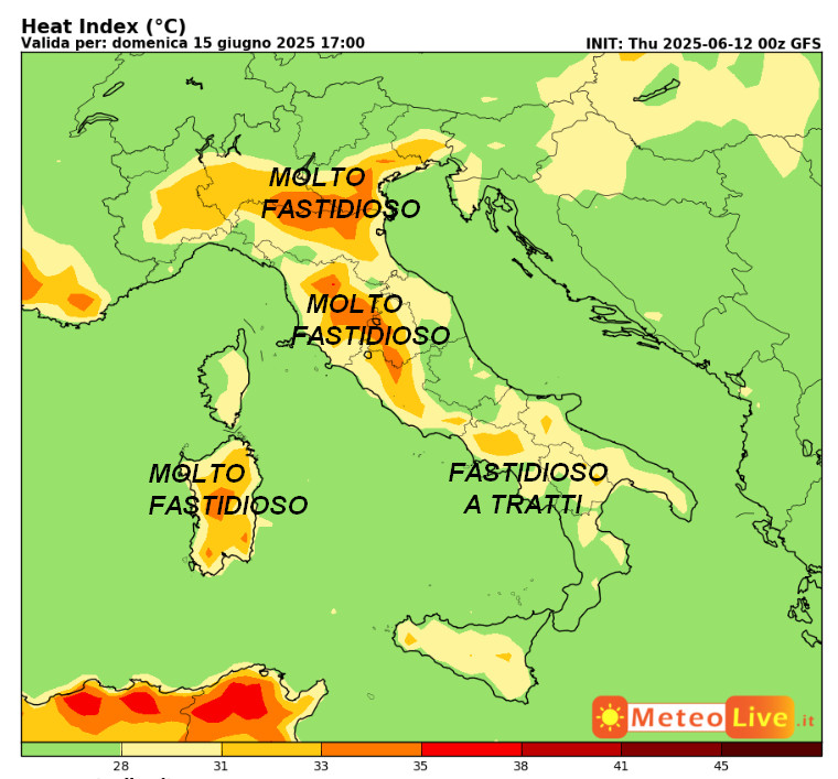 La terza mappa mostra invece il DISAGIO da CALDO atteso in Italia alle ore 17 di DOMENICA 15 GIUGNO: