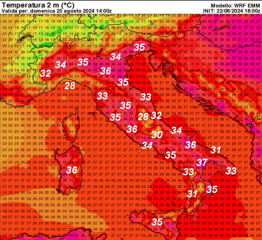 Termometro a 37° sulla Lucania, 36° in Sardegna, nel Foggiano e sulla Valpadana orientale, 35° in Sicilia, Calabria Ionica, Campania, Pianura Lombarda e pianure interne della Toscana.