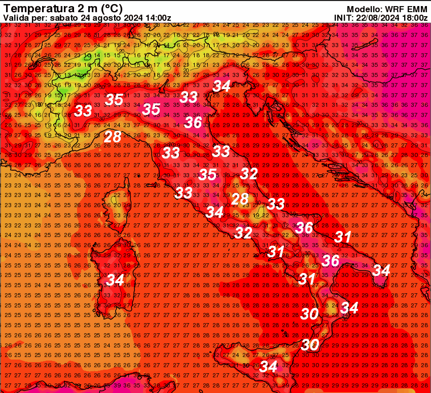 Punte di 36° saranno possibili sulla Pianura Emiliana e sulla Lucania, 35° nelle pianure interne della Toscana e sul Veneto. Quasi la totalità delle aree di pianura o di costa avrà temperature superiori a 30°.