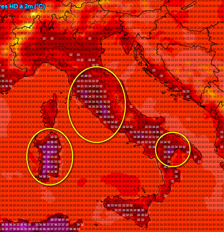 Situazione critica nelle aree interne della Sardegna con il termometro che potrebbe toccare i 40°, 37° nelle aree interne del Lazio, 36° nella Toscana interna e 35° nelle aree interne della Sicilia e sulla Lucania.