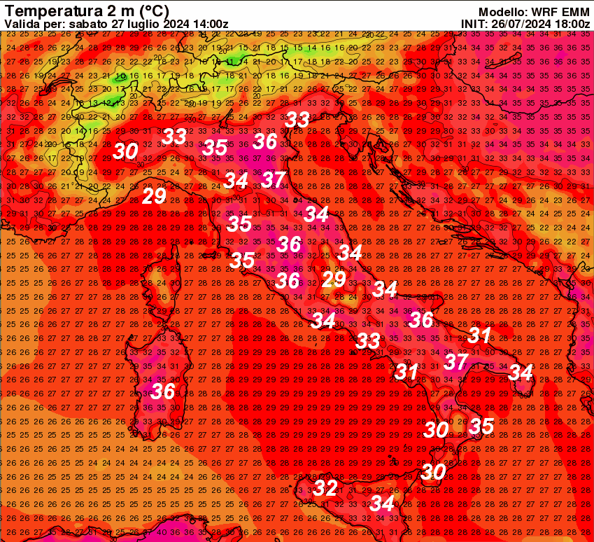 Punte di 37° saranno possibili sulla Lucania e sulla Pianura Emiliana, 36° nelle pianure interne del centro, sul Foggiano e le aree interne della Sardegna. Questo è il DISAGIO da CALDO previsto in Italia per la giornata odierna e per i prossimi giorni.